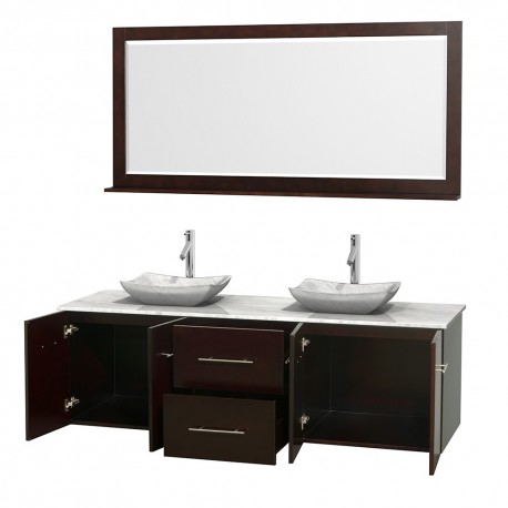 72 inch Double Bathroom Vanity in Espresso, White Carrera Marble Countertop, Avalon White Carrera Marble Sinks, and 70 inch Mirror