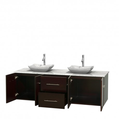 72 inch Double Bathroom Vanity in Espresso, White Carrera Marble Countertop, Avalon White Carrera Marble Sinks, and No Mirror