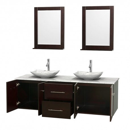 72 inch Double Bathroom Vanity in Espresso, White Carrera Marble Countertop, Arista White Carrera Marble Sinks, and 24 inch Mirrors