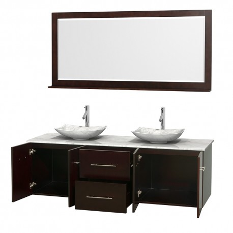 72 inch Double Bathroom Vanity in Espresso, White Carrera Marble Countertop, Arista White Carrera Marble Sinks, and 70 inch Mirror