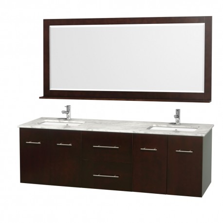 72 inch Double Bathroom Vanity in Espresso, White Carrera Marble Countertop, Square Porcelain Undermount Sinks, and 70 inch Mirror