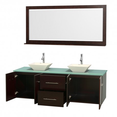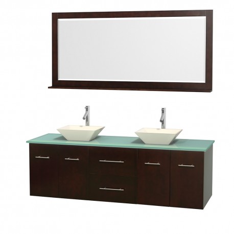 72 inch Double Bathroom Vanity in Espresso, Green Glass Countertop, Pyra Bone Porcelain Sinks, and 70 inch Mirror