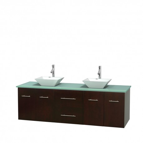 72 inch Double Bathroom Vanity in Espresso, Green Glass Countertop, Pyra White Porcelain Sinks, and No Mirror