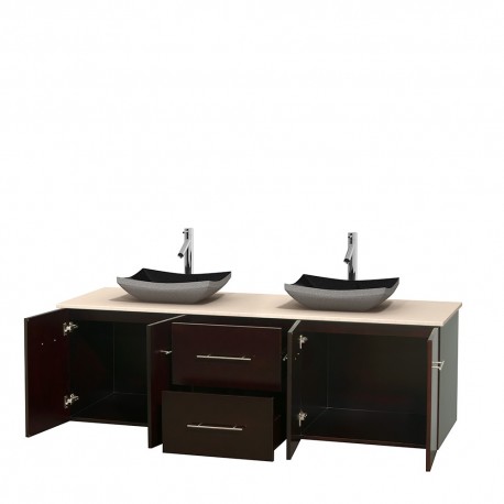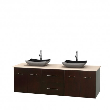 72 inch Double Bathroom Vanity in Espresso, Ivory Marble Countertop, Altair Black Granite Sinks, and No Mirror