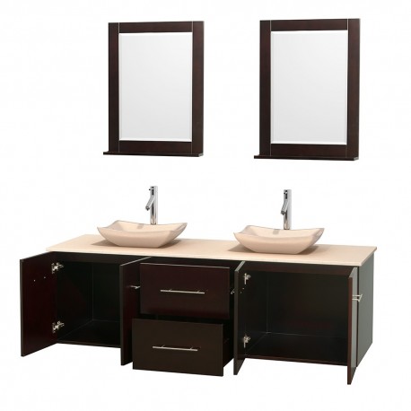 72 inch Double Bathroom Vanity in Espresso, Ivory Marble Countertop, Avalon Ivory Marble Sinks, and 24 inch Mirrors