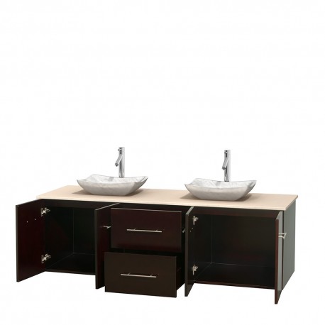 72 inch Double Bathroom Vanity in Espresso, Ivory Marble Countertop, Avalon White Carrera Marble Sinks, and No Mirror