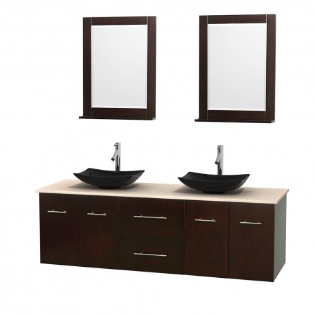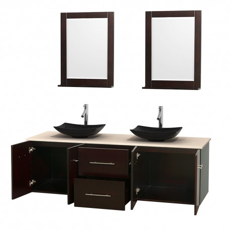 72 inch Double Bathroom Vanity in Espresso, Ivory Marble Countertop, Arista Black Granite Sinks, and 24 inch Mirrors