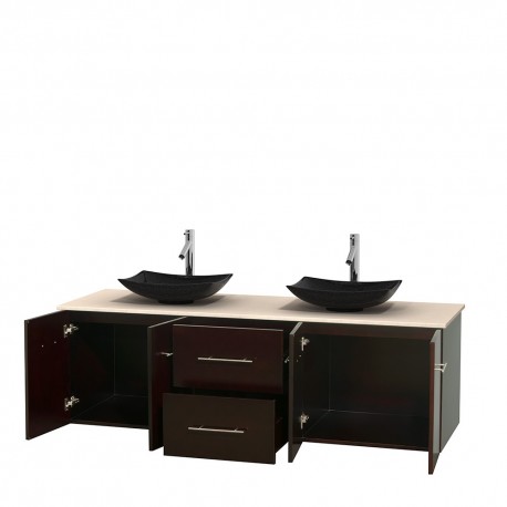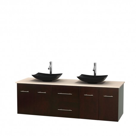 72 inch Double Bathroom Vanity in Espresso, Ivory Marble Countertop, Arista Black Granite Sinks, and No Mirror