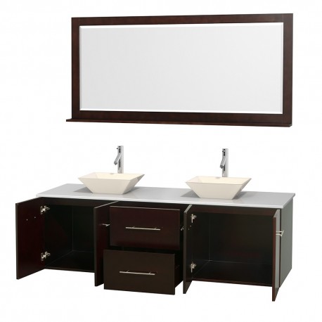 72 inch Double Bathroom Vanity in Espresso, White Man-Made Stone Countertop, Pyra Bone Porcelain Sinks, and 70 inch Mirror