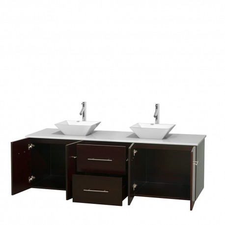 72 inch Double Bathroom Vanity in Espresso, White Man-Made Stone Countertop, Pyra White Porcelain Sinks, and No Mirror