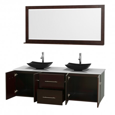 72 inch Double Bathroom Vanity in Espresso, White Man-Made Stone Countertop, Arista Black Granite Sinks, and 70 inch Mirror