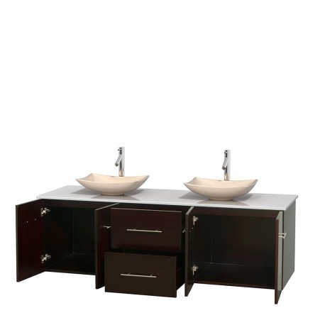 72 inch Double Bathroom Vanity in Espresso, White Man-Made Stone Countertop, Arista Ivory Marble Sinks, and No Mirror