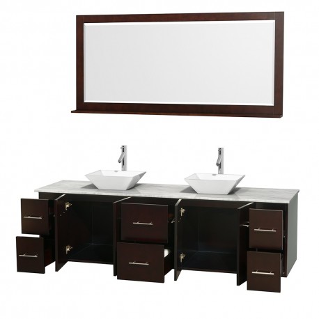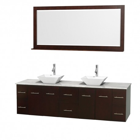 80 inch Double Bathroom Vanity in Espresso, White Carrera Marble Countertop, Pyra White Porcelain Sinks, and 70 inch Mirror