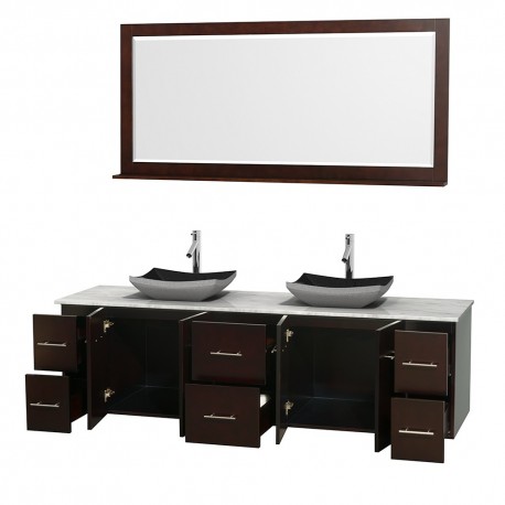 80 inch Double Bathroom Vanity in Espresso, White Carrera Marble Countertop, Altair Black Granite Sinks, and 70 inch Mirror