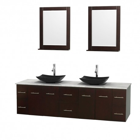 80 inch Double Bathroom Vanity in Espresso, White Carrera Marble Countertop, Arista Black Granite Sinks, and 24 inch Mirrors