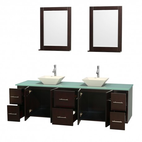 80 inch Double Bathroom Vanity in Espresso, Green Glass Countertop, Pyra Bone Porcelain Sinks, and 24 inch Mirrors