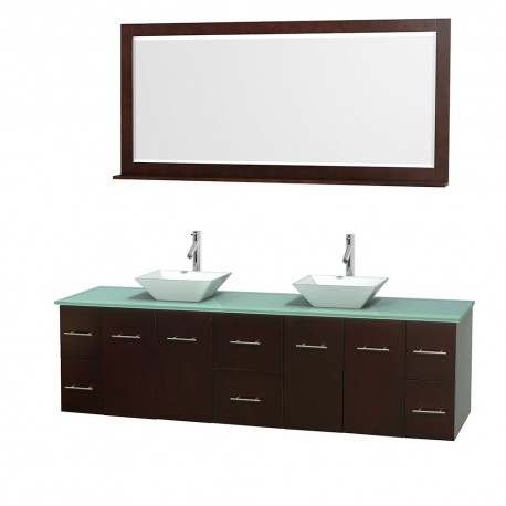 80 inch Double Bathroom Vanity in Espresso, Green Glass Countertop, Pyra White Porcelain Sinks, and 70 inch Mirror