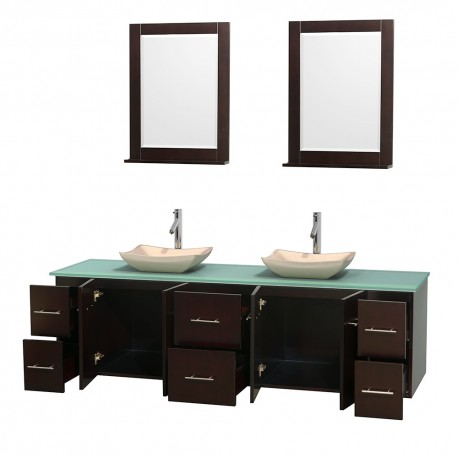 80 inch Double Bathroom Vanity in Espresso, Green Glass Countertop, Avalon Ivory Marble Sinks, and 24 inch Mirrors
