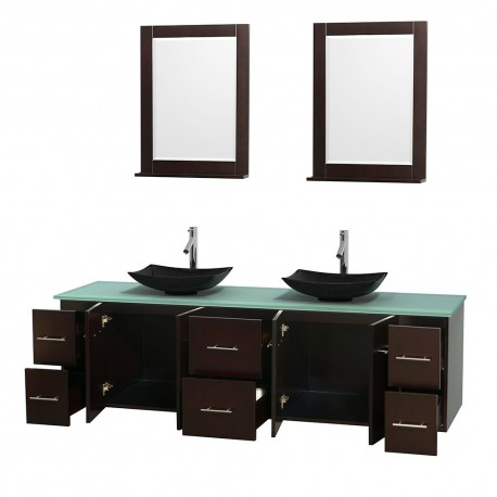 80 inch Double Bathroom Vanity in Espresso, Green Glass Countertop, Arista Black Granite Sinks, and 24 inch Mirrors