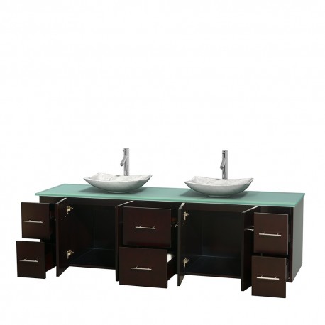 80 inch Double Bathroom Vanity in Espresso, Green Glass Countertop, Arista White Carrera Marble Sinks, and No Mirror