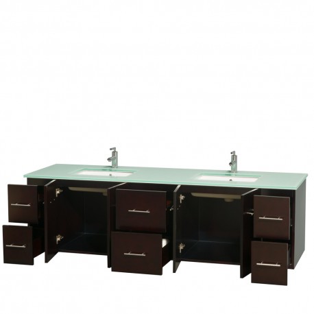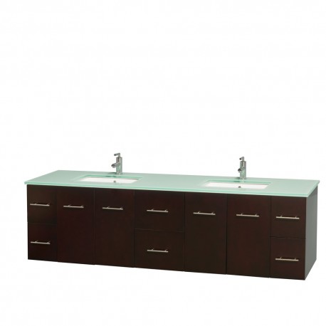 80 inch Double Bathroom Vanity in Espresso, Green Glass Countertop, Undermount Square Sinks, and No Mirror
