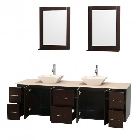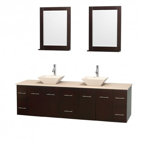80 inch Double Bathroom Vanity in Espresso, Ivory Marble Countertop, Pyra Bone Porcelain Sinks, and 24 inch Mirrors
