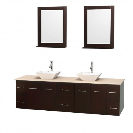 80 inch Double Bathroom Vanity in Espresso, Ivory Marble Countertop, Pyra White Porcelain Sinks, and 24 inch Mirrors