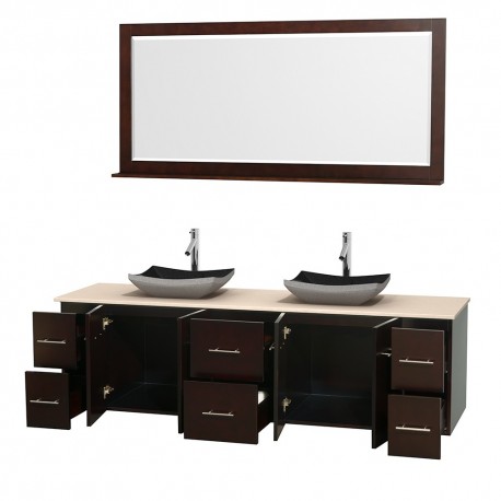 80 inch Double Bathroom Vanity in Espresso, Ivory Marble Countertop, Altair Black Granite Sinks, and 70 inch Mirror