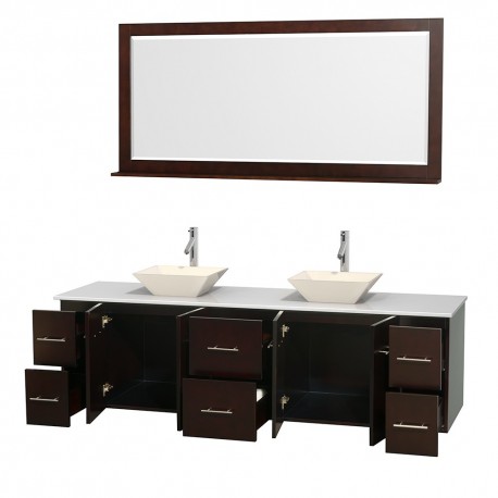 80 inch Double Bathroom Vanity in Espresso, White Man-Made Stone Countertop, Pyra Bone Porcelain Sinks, and 70 inch Mirror
