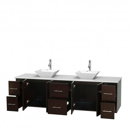 80 inch Double Bathroom Vanity in Espresso, White Man-Made Stone Countertop, Pyra White Porcelain Sinks, and No Mirror