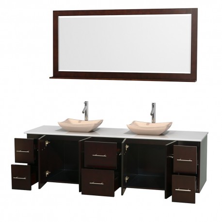 80 inch Double Bathroom Vanity in Espresso, White Man-Made Stone Countertop, Avalon Ivory Marble Sinks, and 70 inch Mirror