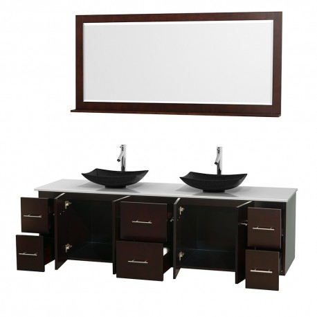 80 inch Double Bathroom Vanity in Espresso, White Man-Made Stone Countertop, Arista Black Granite Sinks, and 70 inch Mirror