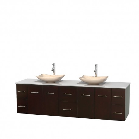80 inch Double Bathroom Vanity in Espresso, White Man-Made Stone Countertop, Arista Ivory Marble Sinks, and No Mirror