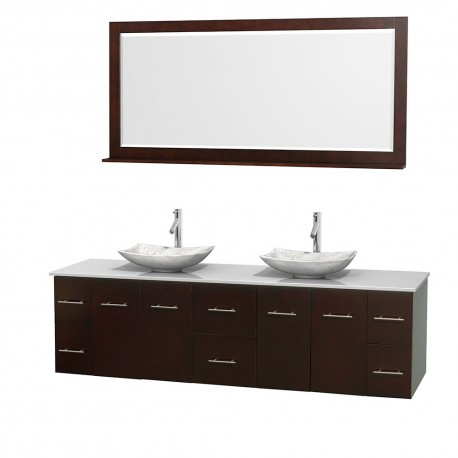 80 inch Double Bathroom Vanity in Espresso, White Man-Made Stone Countertop, Arista White Carrera Marble Sinks, and 70 inch Mirror