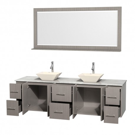 80 inch Double Bathroom Vanity in Gray Oak, White Carrera Marble Countertop, Pyra Bone Porcelain Sinks, and 70 inch Mirror