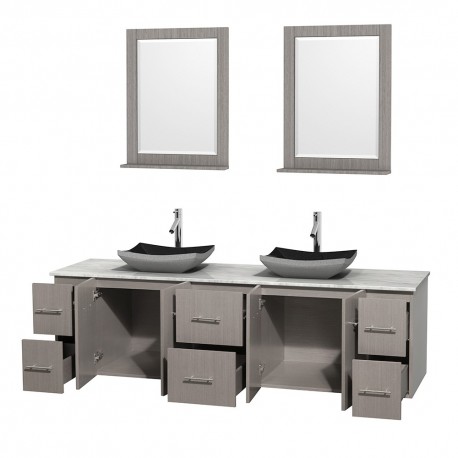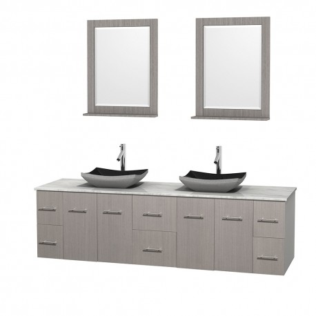 80 inch Double Bathroom Vanity in Gray Oak, White Carrera Marble Countertop, Altair Black Granite Sinks, and 24 inch Mirrors