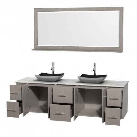 80 inch Double Bathroom Vanity in Gray Oak, White Carrera Marble Countertop, Altair Black Granite Sinks, and 70 inch Mirror