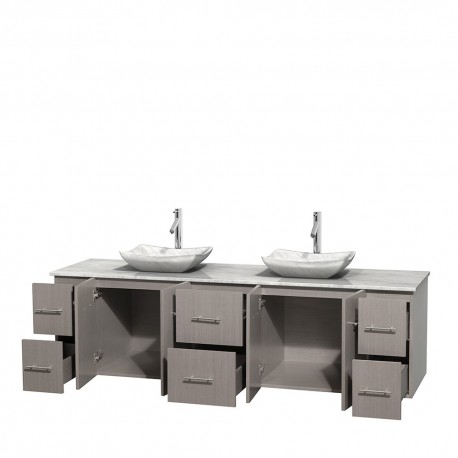 80 inch Double Bathroom Vanity in Gray Oak, White Carrera Marble Countertop, Avalon White Carrera Marble Sinks, and No Mirror