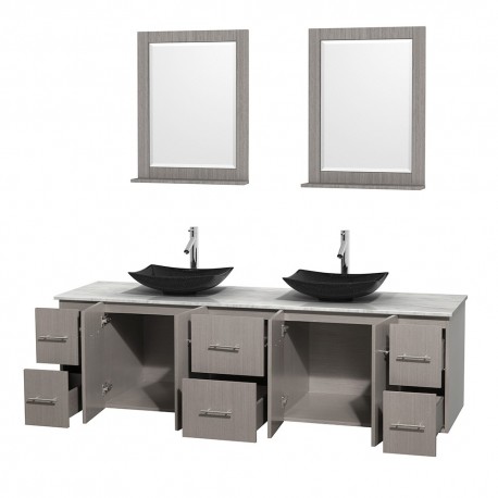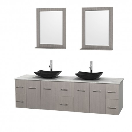 80 inch Double Bathroom Vanity in Gray Oak, White Carrera Marble Countertop, Arista Black Granite Sinks, and 24 inch Mirrors