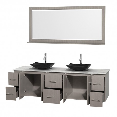 80 inch Double Bathroom Vanity in Gray Oak, White Carrera Marble Countertop, Arista Black Granite Sinks, and 70 inch Mirror