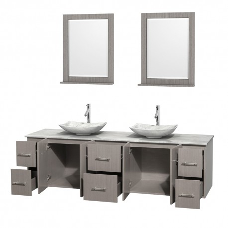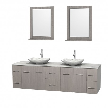 80 inch Double Bathroom Vanity in Gray Oak, White Carrera Marble Countertop, Arista White Carrera Marble Sinks, and 24 inch Mirrors