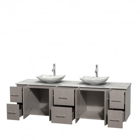 80 inch Double Bathroom Vanity in Gray Oak, White Carrera Marble Countertop, Arista White Carrera Marble Sinks, and No Mirror