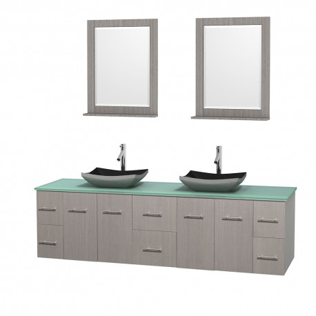 80 inch Double Bathroom Vanity in Gray Oak, Green Glass Countertop, Altair Black Granite Sinks, and 24 inch Mirrors