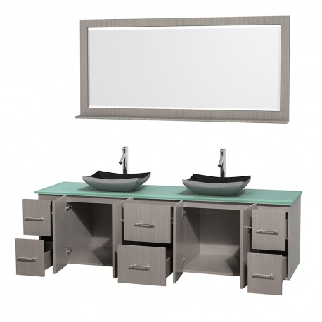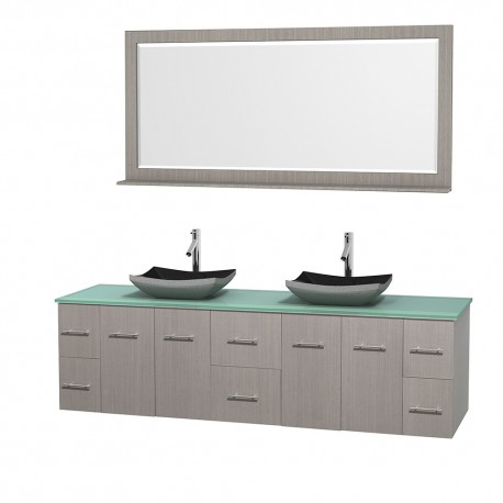 80 inch Double Bathroom Vanity in Gray Oak, Green Glass Countertop, Altair Black Granite Sinks, and 70 inch Mirror