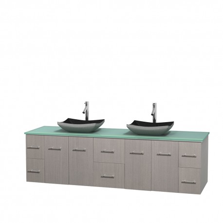 80 inch Double Bathroom Vanity in Gray Oak, Green Glass Countertop, Altair Black Granite Sinks, and No Mirror