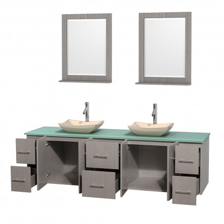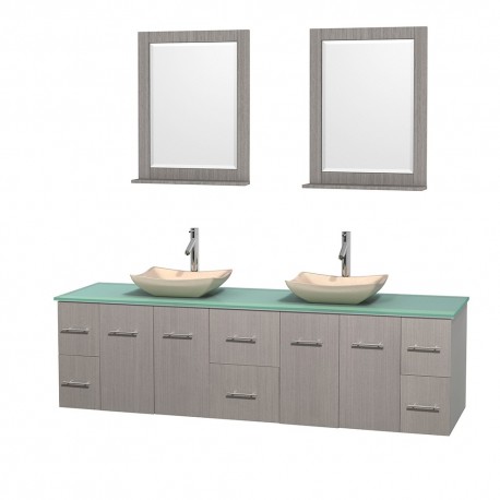 80 inch Double Bathroom Vanity in Gray Oak, Green Glass Countertop, Avalon Ivory Marble Sinks, and 24 inch Mirrors