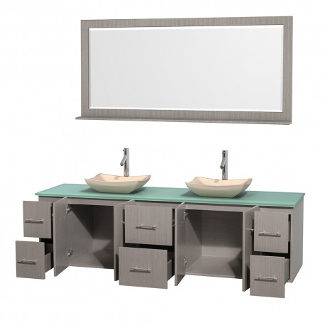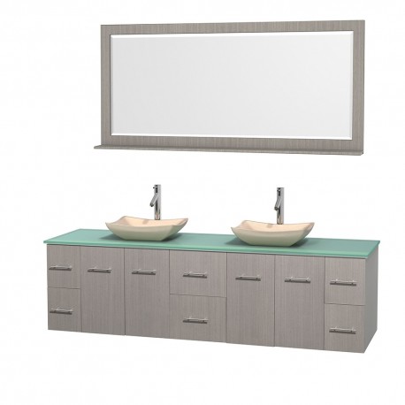 80 inch Double Bathroom Vanity in Gray Oak, Green Glass Countertop, Avalon Ivory Marble Sinks, and 70 inch Mirror