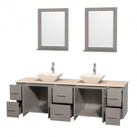 80 inch Double Bathroom Vanity in Gray Oak, Ivory Marble Countertop, Pyra Bone Porcelain Sinks, and 24 inch Mirrors