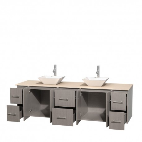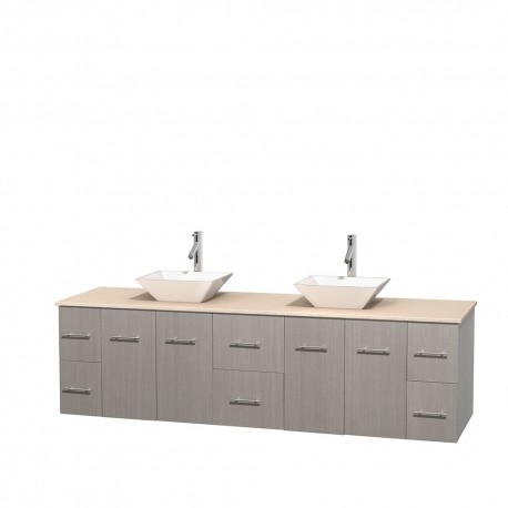 80 inch Double Bathroom Vanity in Gray Oak, Ivory Marble Countertop, Pyra White Porcelain Sinks, and No Mirror