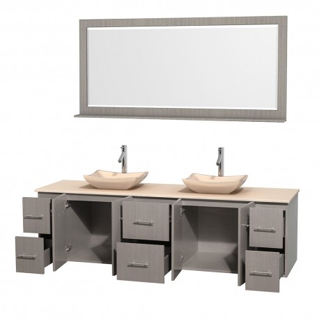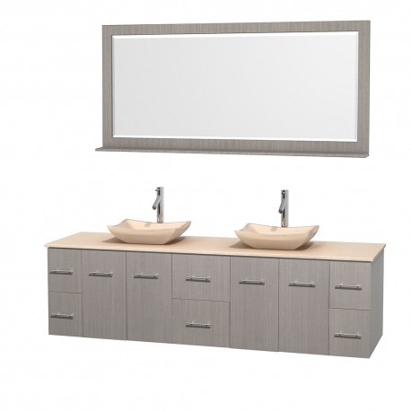 80 inch Double Bathroom Vanity in Gray Oak, Ivory Marble Countertop, Avalon Ivory Marble Sinks, and 70 inch Mirror